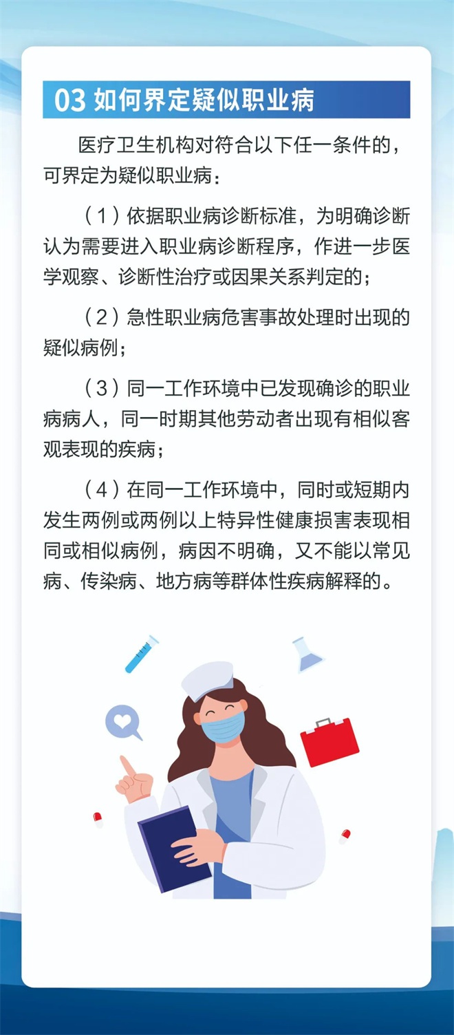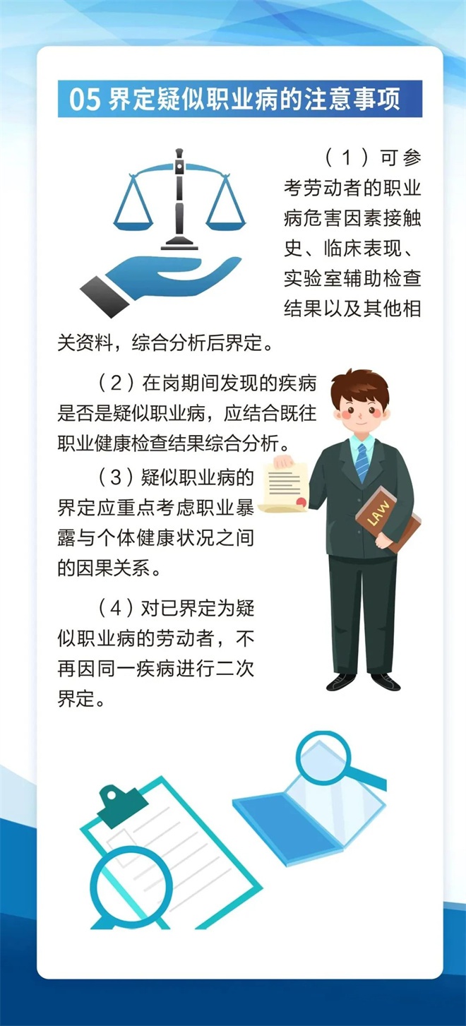 保護勞動者健康,一起了解疑似職業(yè)病的概念定義、法律依據(jù)、界定標準、處理原則、在界定疑似職業(yè)病過程中的注意事項,以及疑似職業(yè)病病人依法享有的權(quán)益。